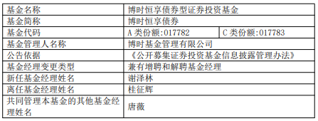 中国经济网北京1月23日讯 今日,博时基金公告,博时恒享债券增聘谢泽林,桂征辉离任。