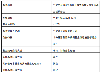中国经济网北京1月26日讯 近日,平安基金公告,平安中证A50ETF联接增聘李严,翁欣离任。