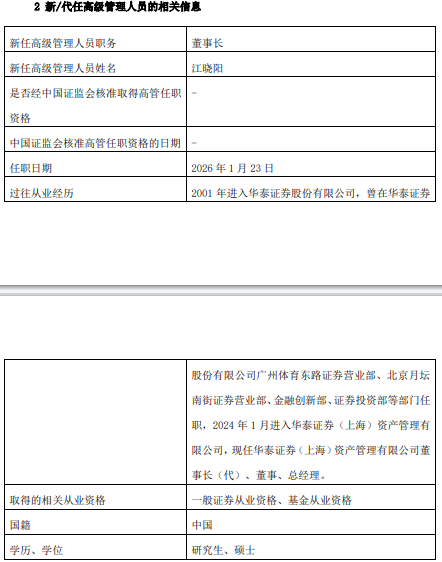 中国经济网北京1月26日讯 近日,华泰证券(上海)资产管理有限公司任命原总经理江晓阳为董事长;原副总经理朱前为总经理。任命刘博文为首席风险官,原首席风险官覃洁离任。