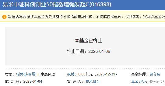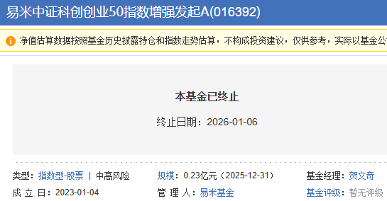 基金管理人已就该事项于2026年1月6日刊登了《关于易米中证科创创业50指数增强型发起式证券投资基金发生基金合同终止情形及基金财产清算的公告》。该基金最后运作日为2026年1月5日,自2026年1月6日起进入清算程序。自2026年1月6日起,停止收取基金管理费、基金托管费和销售服务费,亦不再开放申购、赎回、转换、定期定额投资等业务。