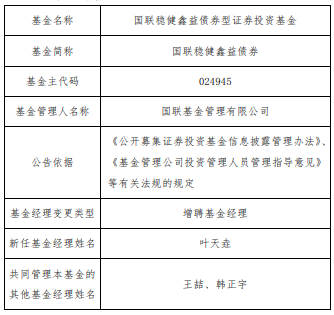中国经济网北京1月28日讯 今日,国联基金公告,国联稳健鑫益债券增聘叶天垚。