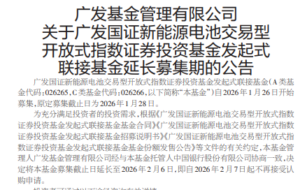 公告称,广发国证新能源电池交易型开放式指数证券投资基金发起式联接基金(A类基金代码:026265,C类基金代码:026266)自2026年1月26日开始募集,原定募集截止日为2026年1月28日。决定将该基金募集截止日延长至2026年2月6日,即自2026年2月7日起不再接受认购申请。