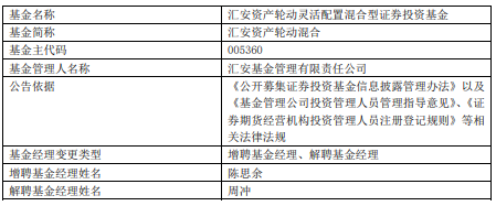 中国经济网北京1月30日讯 今日,汇安基金公告,汇安资产轮动混合增聘陈思余,周冲离任。