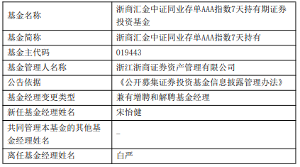 中国经济网北京2月2日讯 近日,浙商证券资产管理有限公司公告,白严离任浙商汇金月享30天滚动持有中短债、浙商汇金聚泓两年定开债、浙商汇金聚兴一年定开债券发起式、浙商汇金金算盘货币、浙商汇金聚盈中短债、浙商汇金中证同业存单AAA指数7天持有、浙商汇金聚利一年定期。