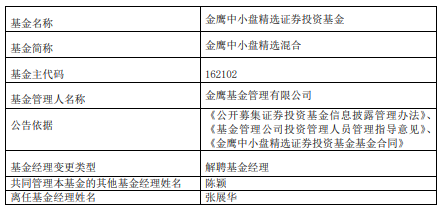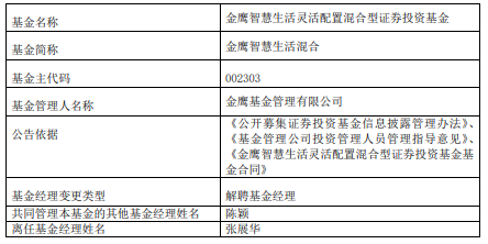 中国经济网北京2月2日讯 近日,金鹰基金公告,张展华离任金鹰智慧生活混合、金鹰中小盘精选混合、金鹰红利价值混合。