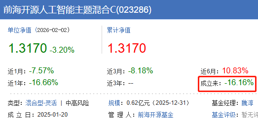 但从2025年1月20日成立的前海开源人工智能主题混合C看,其累计收益率目前依然亏损了16.16%。而成立于2016年5月4日的A份额在成立近10年的累计收益率也仅有32.24%。