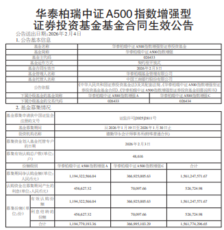 中国经济网北京2月4日讯 今日,华泰柏瑞基金发布华泰柏瑞中证A500指数增强型证券投资基金基金合同生效公告。