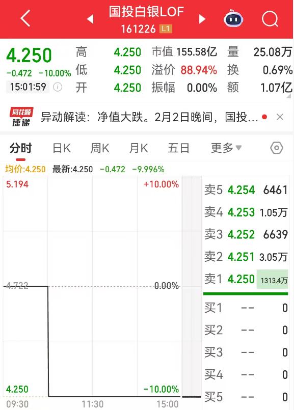 自2月2日复牌交易以来,国投白银LOF已经连续两天跌停。截至2月3日收盘,该基金挂跌停价卖出的资金依旧超55亿元,而日内成交量仅1亿元左右,此前一天挂跌停价卖单更是超80亿元;此次估值调整后,该基金场内价格溢价率高达88.94%。从静态看,若该基金溢价率恢复至此前常态的10%左右,场内价格还面临“腰斩”风险。