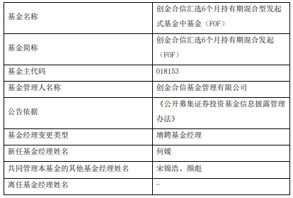 中国经济网北京2月5日讯 今日,创金合信基金公告,创金合信汇选6个月持有期混合发起FOF、创金合信宜久来福3个月持有期混合发起FOF增聘何媛。