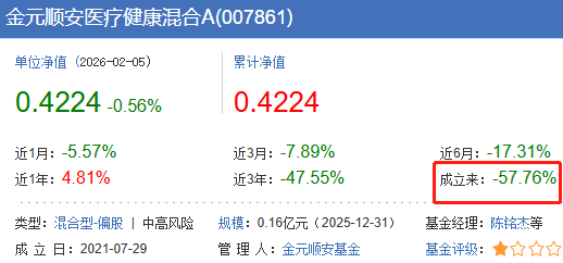 根据天天基金网最新数据看,成立于2021年7月29日的金元顺安医疗健康混合A/C,截至2026年2月5日的最新累计收益率为-57.76%和-58.15%。该基金先后经历2次基金经理变更,目前由陈铭杰和张海东共同管理,但从各阶段的基金经理任职回报看,都无一盈利。