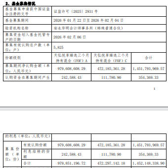 募集期间净认购金额1,451,793,969.57元,认购资金在募集期间产生的利息354,369.33元,募集份额合计1,452,148,338.90份。