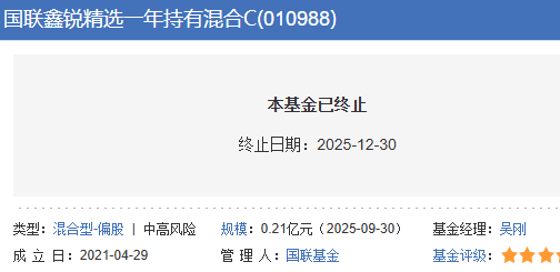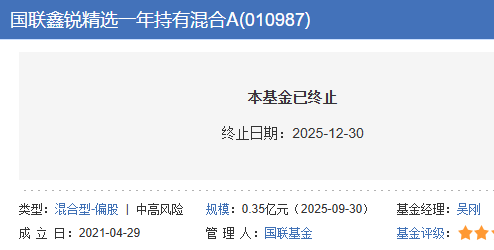 根据《国联基金管理有限公司关于国联鑫锐研究精选一年持有期混合型证券投资基金基金合同终止、进入赎回选择期及基金财产清算的公告》,该基金最后运作日为2025年12月29日,自2025年12月30日(最后运作日的下一日)起进入清算程序。该基金进入清算程序后,不再开放办理申购、赎回、转换及定期定额投资等业务,并停止收取基金管理费、基金托管费和销售服务费。