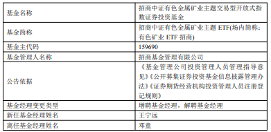中国经济网北京2月10日讯 今日,招商基金公告,招商中证有色金属矿业主题ETF增聘王宁远,邓童离任。