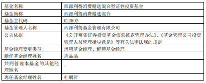 中国经济网北京2月11日讯 今日,西部利得基金公告,西部利得消费精选混合增聘周晶晶,杜朋哲离任。