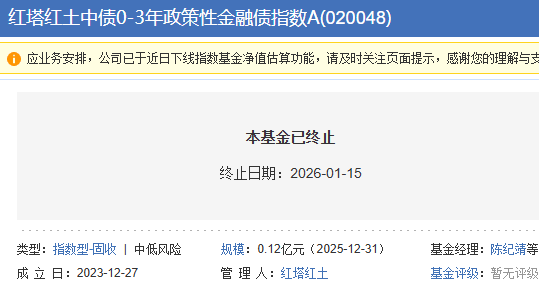 截至2026年1月14日,该基金已出现连续50个工作日基金资产净值低于5000万元的情形,该基金已触发《基金合同》中约定的基金终止条款。基金管理人已于2026年1月15日就该事项发布了《红塔红土基金管理有限公司关于红塔红土中债0-3年政策性金融债指数证券投资基金基金合同终止及基金财产清算的公告》,该基金最后运作日为2026年1月14日,自2026年1月15日起进入基金财产清算程序。