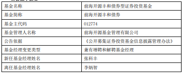 张科丰2014年7月至2016年9月任中国人寿养老保险股份有限公司信用评估部信用分析师;2016年10月至2019年6月任合众资产管理股份有限公司固定收益部债券投资经理助理;2019年7月至2023年7月任国新证券股份有限公司固定收益部投资经理;2023年7月加盟前海开源基金管理有限公司,现任公司基金经理。