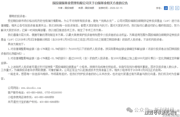 2月2日晚10点,国投瑞银基金发布公告称,鉴于近期白银国际主要市场价格出现显著波动,与上期所白银期货价格差异较大,为公允反映基金资产价值,决定对旗下国投白银LOF的基金资产进行合理重估。