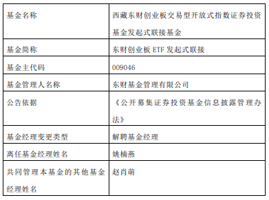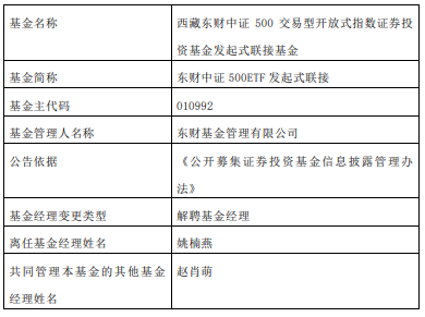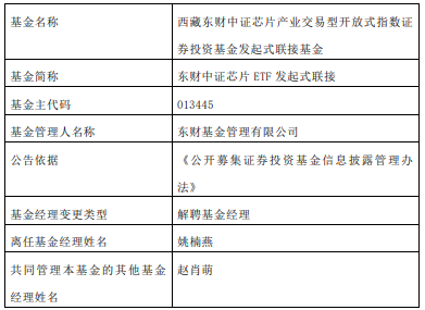 中国经济网北京2月25日讯 今日,东财基金公告,姚楠燕离任东财中证500ETF发起式联接、东财中证证券30ETF发起式联接、东财上证50ETF发起式联接、东财创业板ETF发起式联接、东财中证芯片ETF发起式联接。