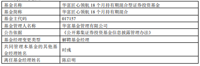 中国经济网北京2月25日讯 近日,华富基金公告,陈启明离任华富匠心领航18个月持有期混合。