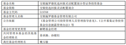 中国经济网北京3月30日讯 近日,交银施罗德基金公告,魏玉敏离任交银优选回报灵活配置混合。