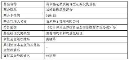 中国经济网北京330日讯 近日,易米基金公告,易米开鑫价值优选混合、易米鑫选品质混合增聘黄晓峰,包丽华离任。