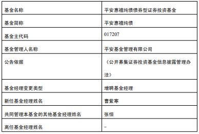 中国经济网北京3月31日讯 近日,平安基金公告,平安惠禧纯债增聘曹紫寒。