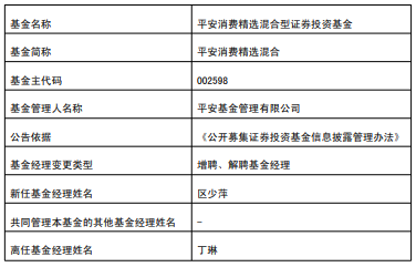 中国经济网北京42日讯 今日,平安基金公告,平安消费精选混合增聘区少萍,丁琳离任。