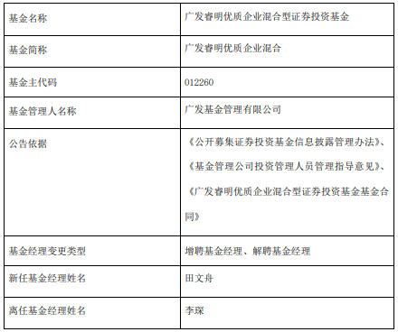 中国经济网北京42日讯 今日,广发基金公告,广发睿明优质企业混合增聘田文舟,李琛离任。