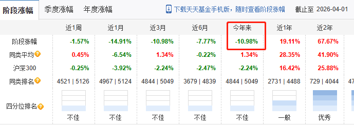 从此前披露的20254季报看,该基金前十大重仓股为中国国航、中国南方航空、中国东方航空、阿里巴巴、天顺风能、中远海能、蒙牛乳业、腾讯控股、李宁、快手。尽管其风格是传统低估与互联网龙头分散布局,但截至今年41日,其在今年内的收益率同样下跌了10.98%,位居5049只有可比业绩的第4844名。