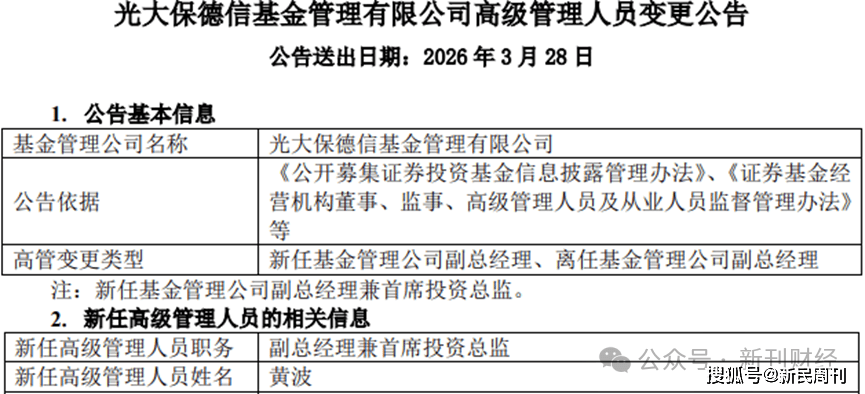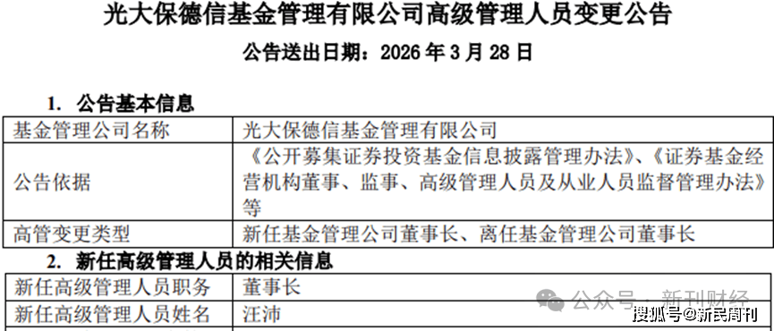 今年3月28日,光大保德信基金(以下简称“公司”)发布高管变更公告,原董事长王翠婷退休,由汪沛接任;原副总经理兼首席投资总监董文卓离任,由黄波升任。