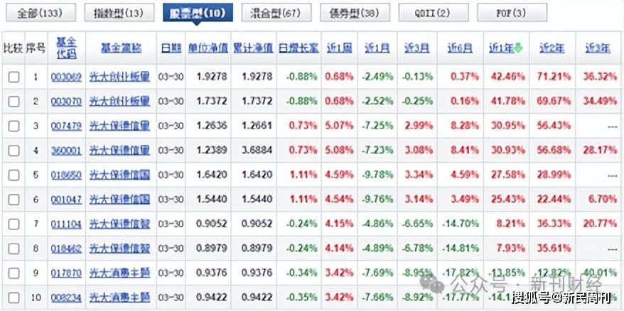 公司部分权益类产品的业绩波动较大。以股票型基金产品为例(不包括混合型),截至3月30日收盘,天天基金网显示,公司全部10只股票型基金产品的净值,在近1月均为负增长,近3月和近6月的情况整体也欠佳。光大消费主题C的累计净值,更是在近3年下降了约40%。