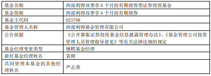 中国经济网北京4月3日讯 今日,西部利得基金公告,西部利得双季享6个月持有期债券增聘袁朔。
