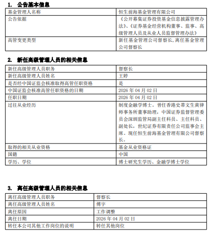 中国经济网北京4月3日讯 今日,恒生前海基金公告,任命王婷为督察长,傅宇离任,转任其他岗位。