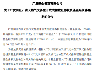 公告称,广发国证石油天然气交易型开放式指数证券投资基金(基金代码:159018;场内简称:石油ETF广发)于2026310日获中国证监会准予募集注册(证监许可〔2026431号)。该基金原定募集期为2026330日至202643日。现决定将该基金的募集期延长至2026410日,自2026411日起不再接受认购申请。