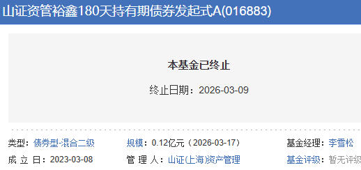 根据基金管理人于202639日公布的《山证(上海)资产管理有限公司关于山证资管裕鑫180天持有期债券型发起式证券投资基金基金合同终止及基金财产清算的公告》,该基金的最后运作日为202638日,并于202639日进入清算程序。