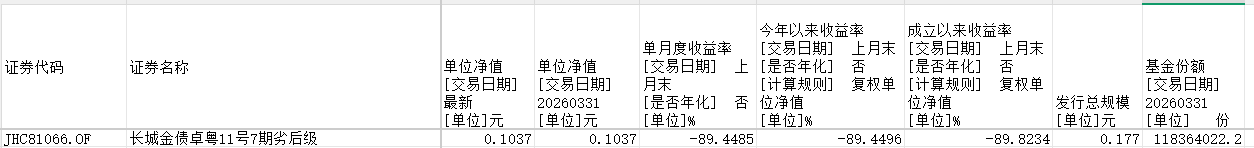 其中,截至2026331日,长城金债卓粤117期劣后级(JHC81066.OF其单位净值为0.1037元,3月单月度收益率为-89.4485%,今年前3个月收益率为-89.4496%,成立以来收益率为-89.8234%