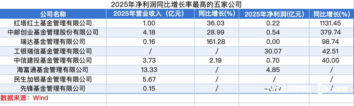 值得关注的是,2025年公募基金行业涌现出一批逆势高增长的公司,净利润增速表现十分突出。在净利润同比增长率最高的十家公司中,红塔红土基金以1131.45%的惊人增速位居榜首,2025年实现营收1.00亿元,同比增长36.03%,净利润0.22亿元。