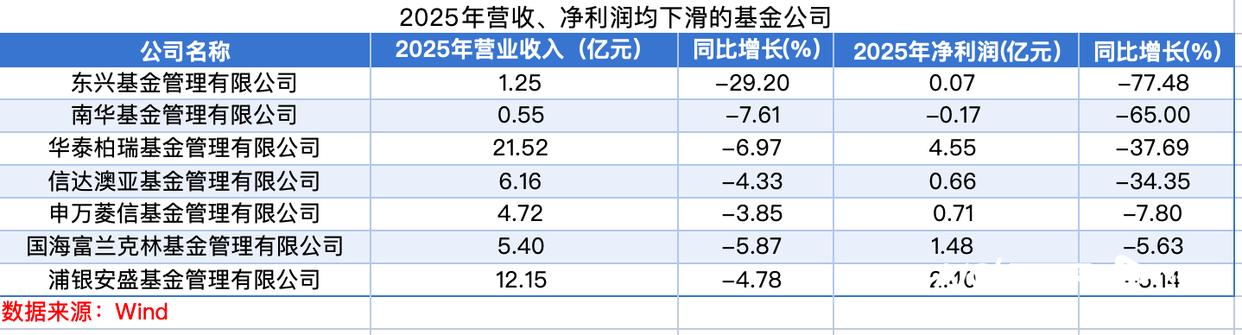与高增长公司形成鲜明对比,2025年共有7家基金公司面临营收和净利润同比双双下滑的困境,分别为华泰柏瑞基金、浦银安盛基金、信达澳亚基金、申万菱信基金、国海富兰克林基金、南华基金、东兴基金。