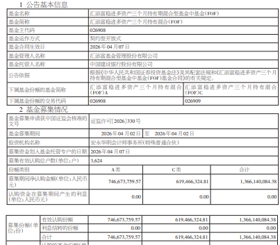 汇添富稳进多资产三个月持有混合成立 规模13.66亿元