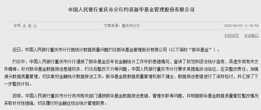 公告称,约谈中,中国人民银行重庆市分行通报了新华基金近年在金融统计工作中的差错情况,宣讲了防范和惩治统计造假、弄虚作假有关文件精神。针对新华基金数据报送差错较多、约谈后整改不力等问题,中国人民银行重庆市分行要求其提高政治站位,压实整改责任,加强源头数据质量管理,切实做好金融统计数据报送工作。新华基金就数据质量管理机制不健全、数据报送差错进行了深刻检讨,并汇报了下一步整改计划。