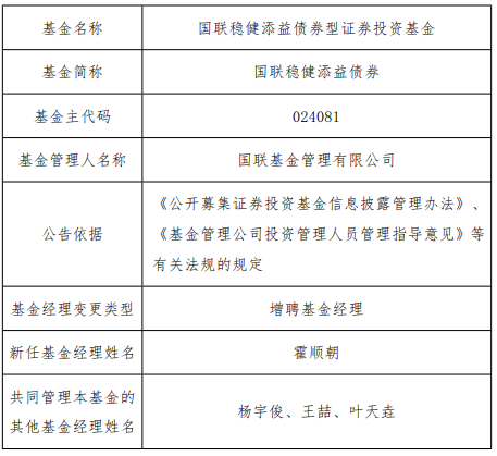 国联稳健添益债券增聘霍顺朝