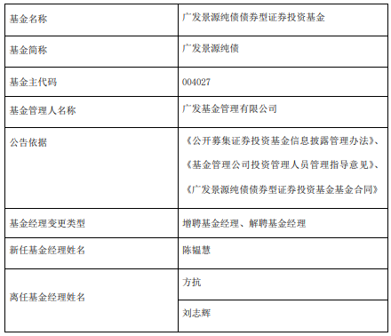 中国经济网北京4月13日讯 近日,广发基金公告,广发景源纯债增聘陈韫慧,方抗与刘志辉离任。