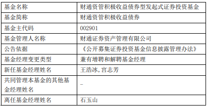 财通资管积极收益债券增聘王浩冰与宫志芳 石玉山离任