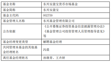 中国经济网北京415日讯 今日,东兴基金公告,孙继青、王卉妍离任东兴安盈宝,冯晨管理。
