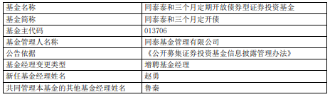 中国经济网北京416日讯 今日,同泰基金公告,同泰同欣混合、同泰泰裕三个月定开债、同泰恒兴纯债、同泰泰和三个月定开债增聘赵勇。