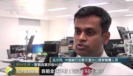 央视记者 陈明磊:我现在所在的这间办公室就是伦敦金融城里外汇交易最活跃的交易室之一,这里主要负责欧洲时段的交易,以及北美和亚太地区交易的无缝链接。在过去的两年中,仅仅在这一个交易室里面,人民币相关产品的交易就实现了翻倍的增长。可以说这里的每一个交易员,都是人民币国际化进程的见证者。