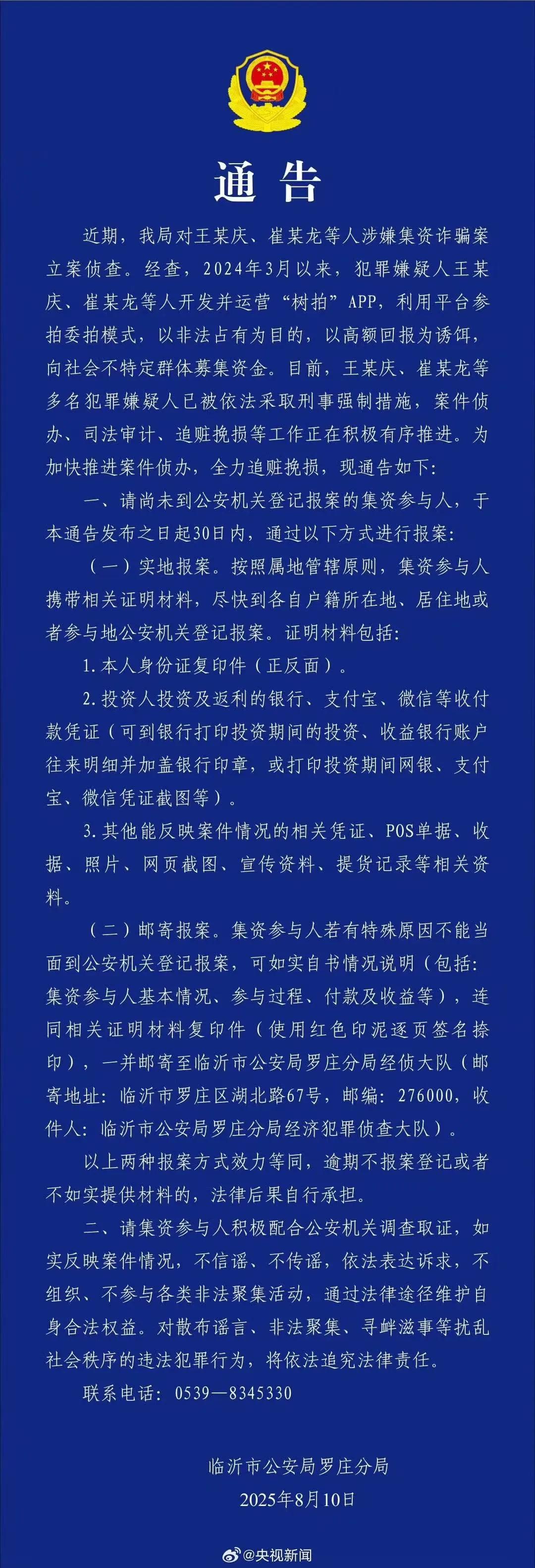 近期,我局对王某庆、崔某龙等人涉嫌集资诈骗案立案侦查。经查,2024年3月以来,犯罪嫌疑人王某庆、崔某龙等人开发并运营“树拍”APP,利用平台参拍委拍模式,以非法占有为目的,以高额回报为诱饵,向社会不特定群体募集资金。目前,王某庆、崔某龙等多名犯罪嫌疑人已被依法采取刑事强制措施,案件侦办、司法审计、追赃挽损等工作正在积极有序推进。为加快推进案件侦办,全力追赃挽损,现通告如下: