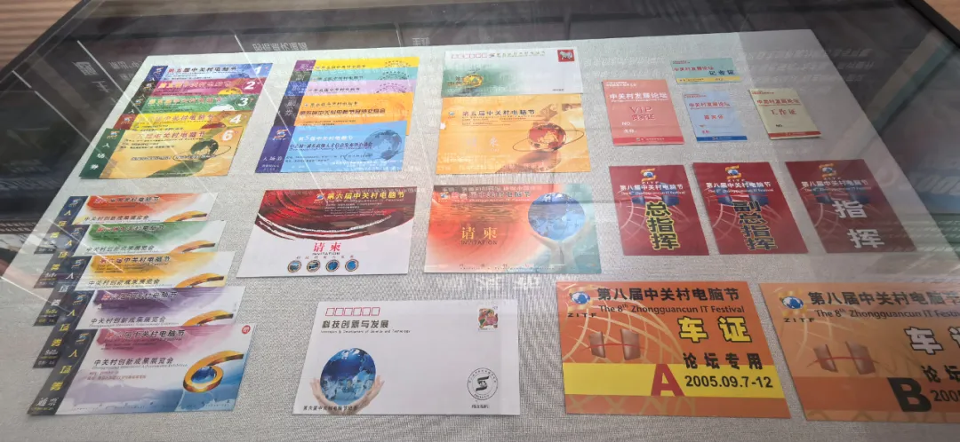 除了这些明信片,在“中关村历史”常设展的重要环节“电子一条街”展厅,展柜里历届中关村电脑节的宣传单、门票、工作证……都是尹世昌老人收集并捐赠的。