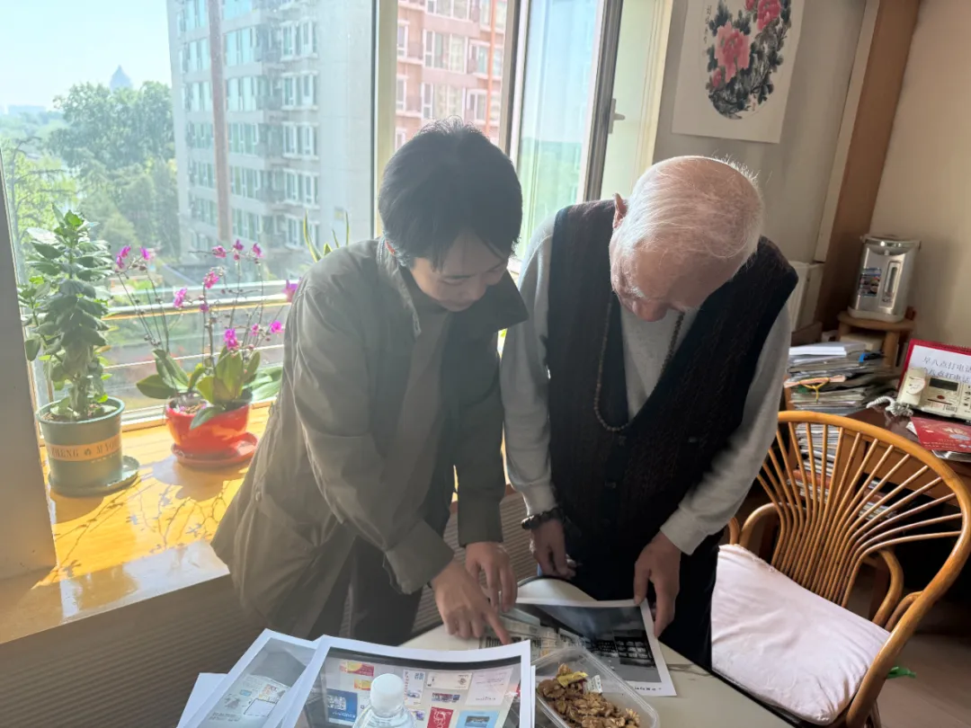 张奕“五一”前探望尹世昌老人时,把展厅中尹老捐赠的展品拍摄打印出来,送给不能到现场的老人。本报记者黄雨寒摄