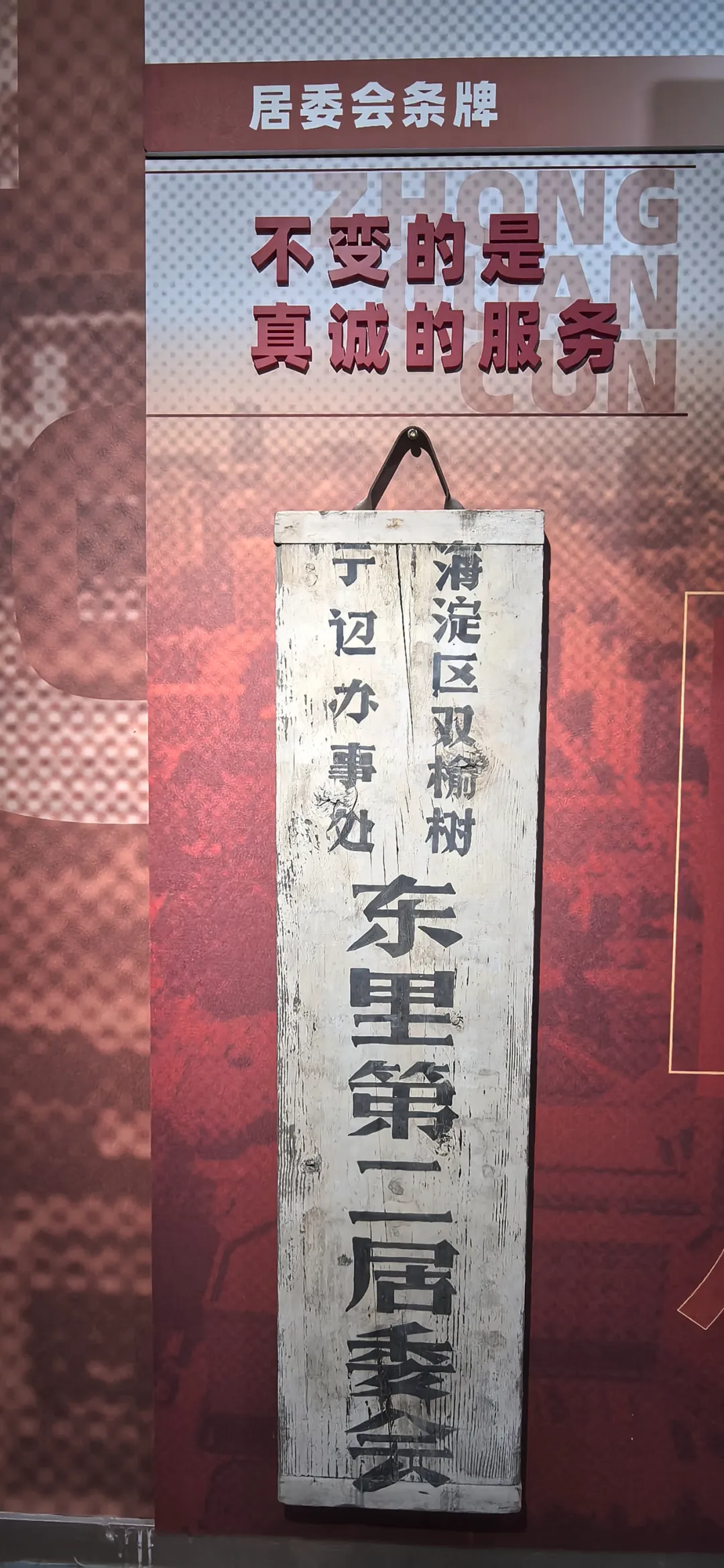 “社区生活”展厅中“海淀区双榆树街道办事处东里第二居委会”条牌。本报记者李牧鸣摄